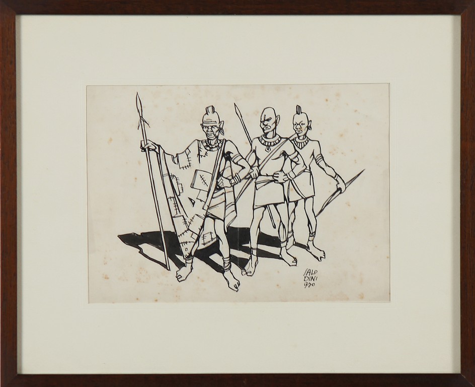 SALODINI CARLO (1903 - 1950) Tre guerrieri africani. China e matita su carta. Cm 25,00 x 18,00. Firmato in basso a destra e datato 930. Cornice presente