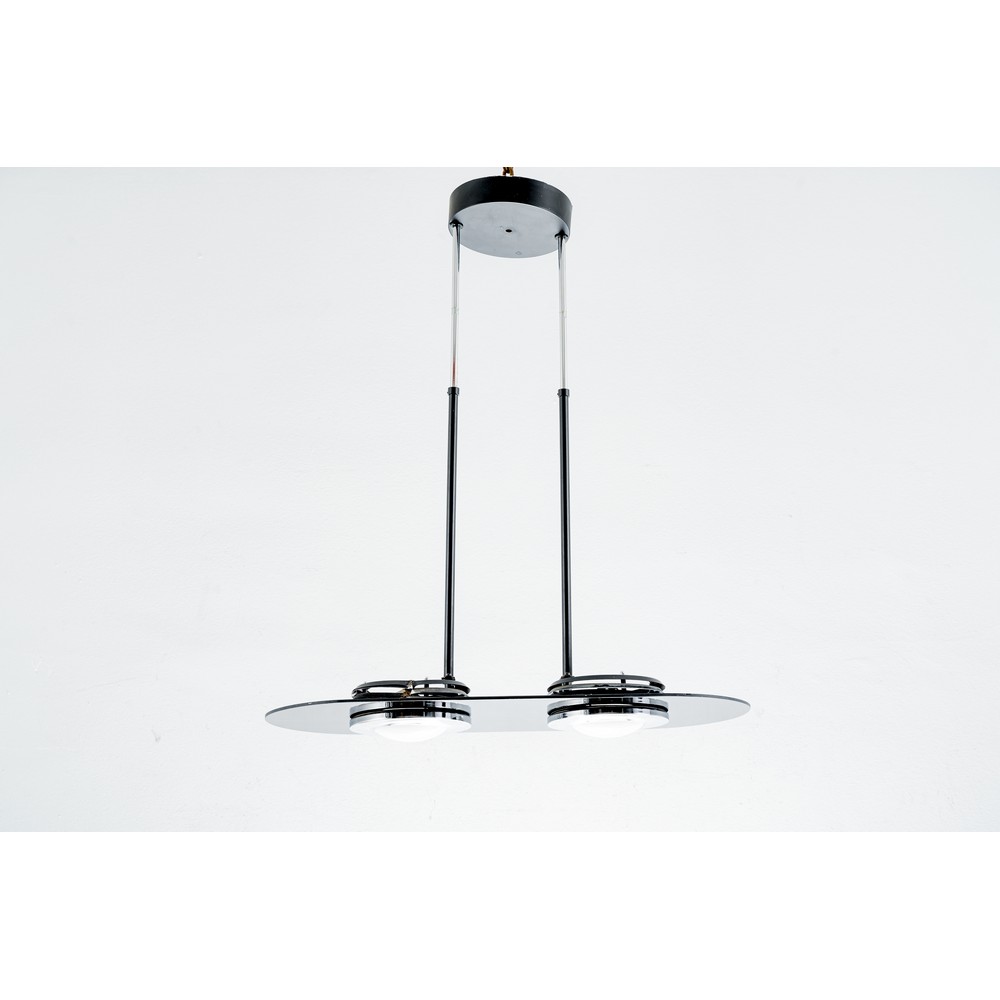 Lampada a sospensione a due luci, struttura in metallo cromato e verniciato nero, diffusore ovale in vetro con alloggio per lampada.