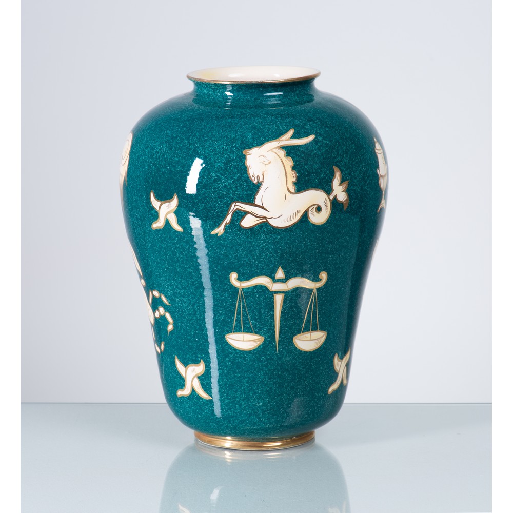 Vaso in ceramica verde con decorazioni a motivo zodiacale bianche e oro, corpo ovalizzato con basso collo, ampia bocca lievemente estroflessa. Base circolare.
