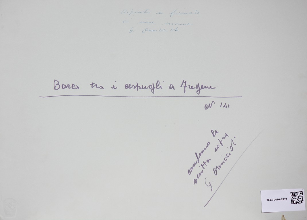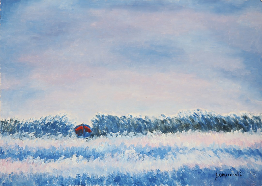 OMICCIOLI GIOVANNI (1901 - 1975) Barca tra i cespugli a Fregene. Olio su cartone. Cm 51,00 x 36,50. Firma in basso a destra. Al retro firma per autentica e titolo.