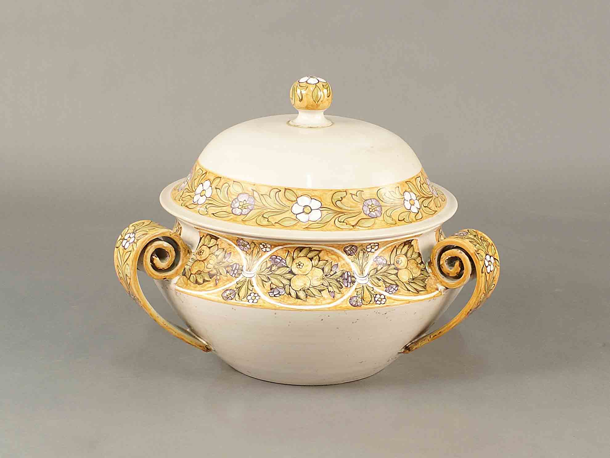 Lotto 317 | Grande centrotavola con coperchio in maiolica decorata a motivo floreale e di...