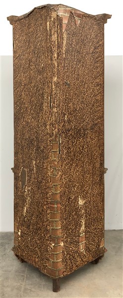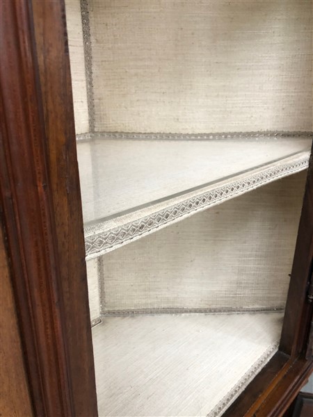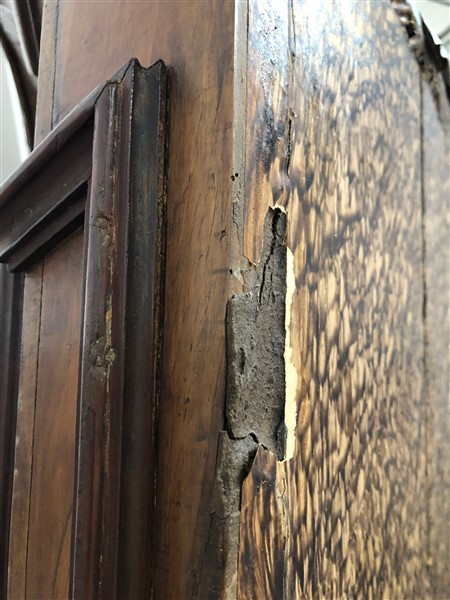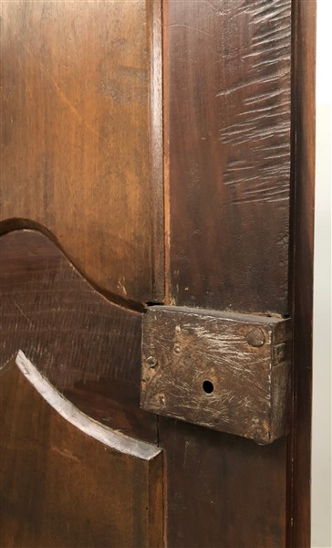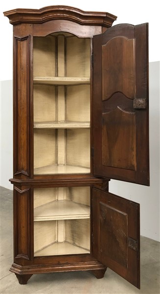 Antico cantonale in noce a due ante pannellate e lesene con bordure modanate, cappello mosso (cm 91x237x63) (difetti e restauri)