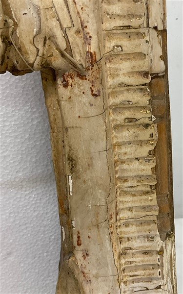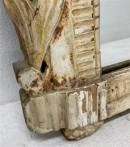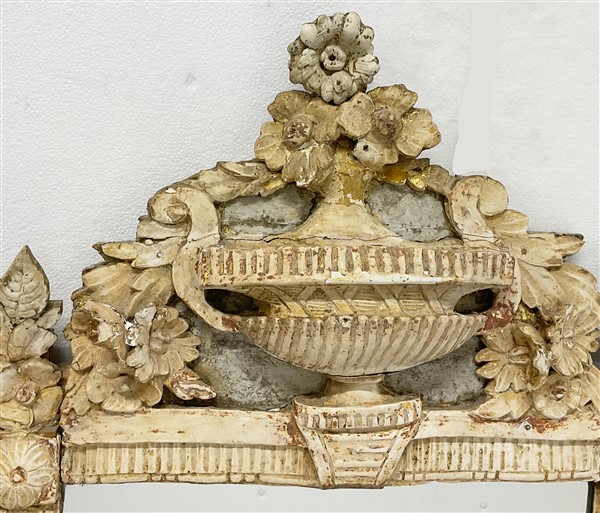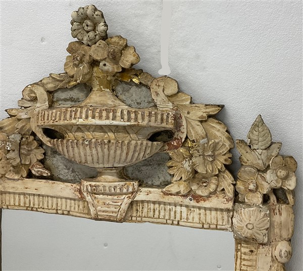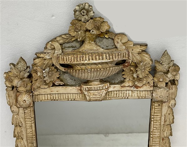Antica specchiera in legno e stucco decorato a fiori e foglie con cimasa sormontata da vaso fiorito. Tracce di doratura (cm 97x60) (difetti e restauri)
