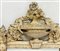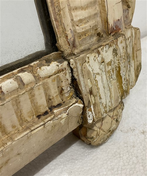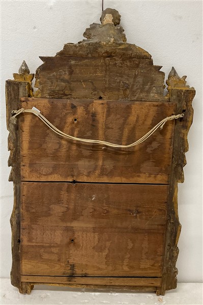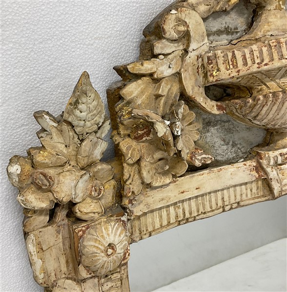 Antica specchiera in legno e stucco decorato a fiori e foglie con cimasa sormon