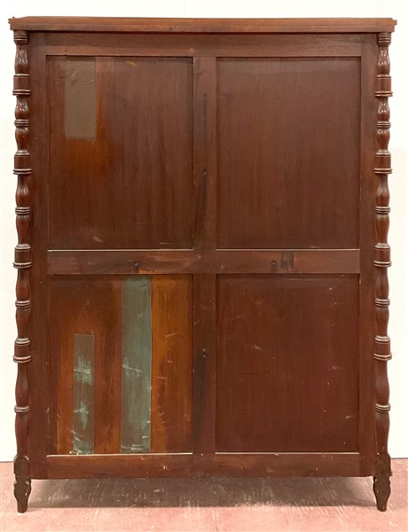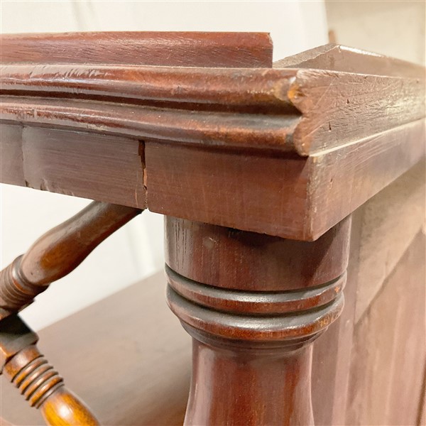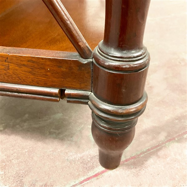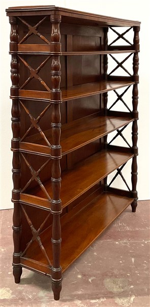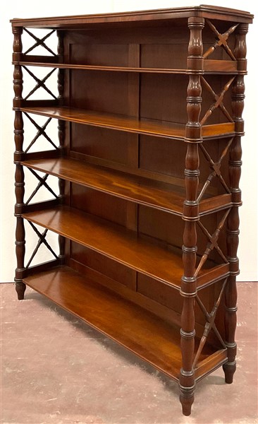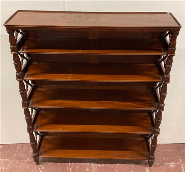 Etagère a cinque ripiani in mogano con montanti e traverse laterali tornite, bo