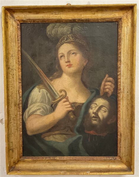 Scuola del secolo XVIII, Giuditta con la testa di Oloferne, olio su tela (cm 68x48) In cornice (difetti e restauri)