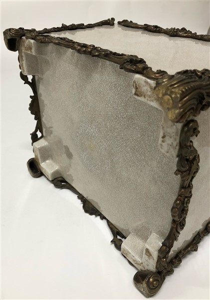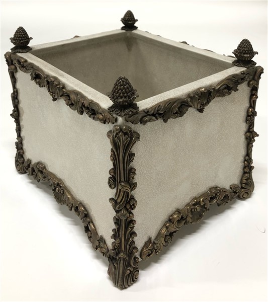 Cachepot in porcellana montata in metallo decorato a volute con finali a pigne (cm 27x20x24) (lievi difetti)