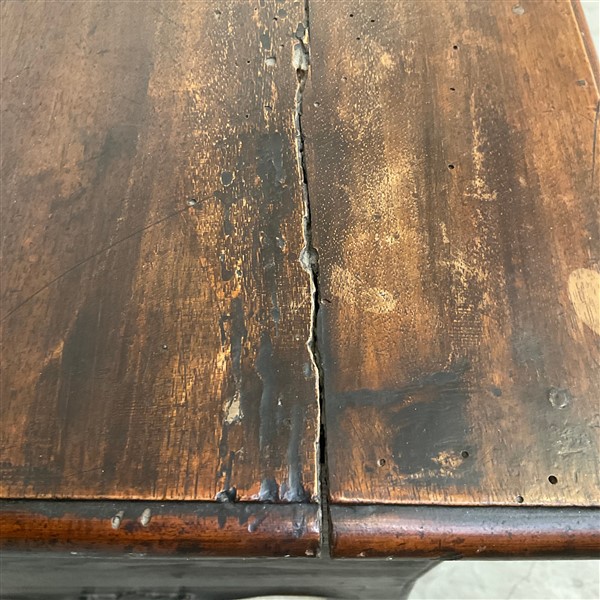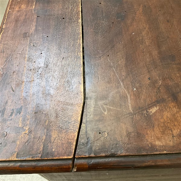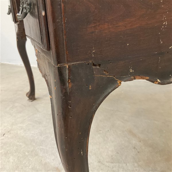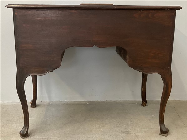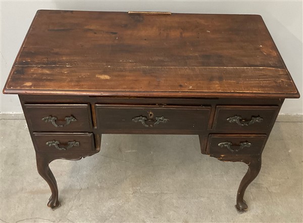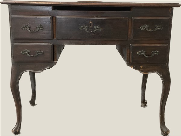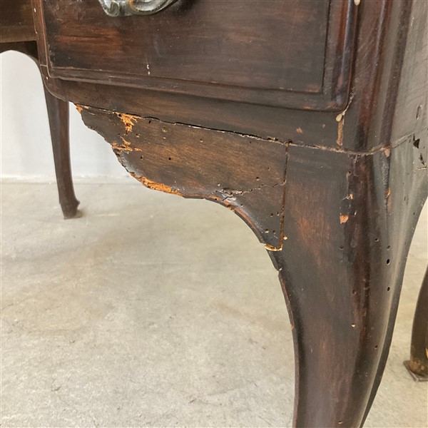 Piccolo scrittoio in legno tinto con fronte a cinque cassetti, gambe mosse (cm 85x70x45,5) (difetti, mancanze e restauri)