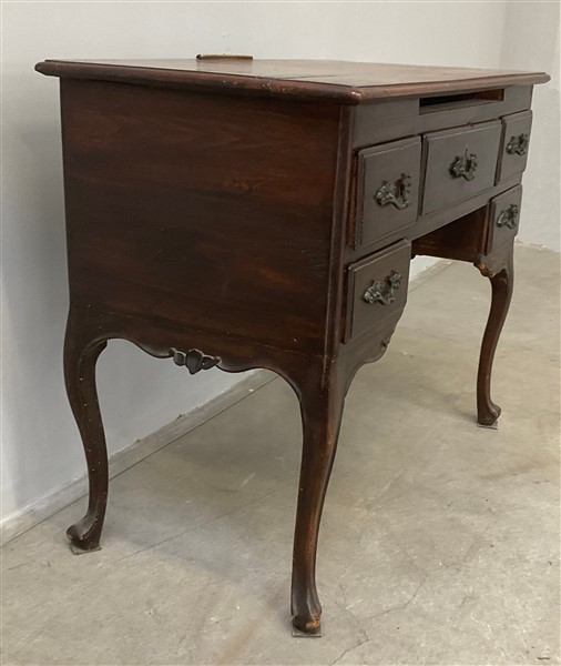 Piccolo scrittoio in legno tinto con fronte a cinque cassetti, gambe mosse (cm