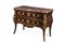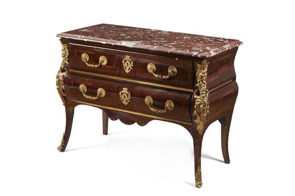 Antico comò di forma mossa a due cassetti lastronato e filettato, maniglie e fregi a volute e mascheroni in bronzo dorato. Piano in marmo rosso (cm 110x81x50) (difetti)