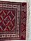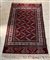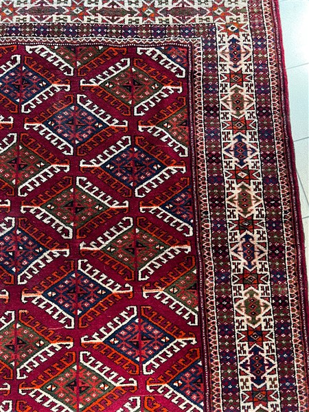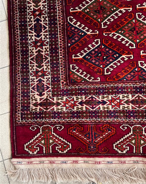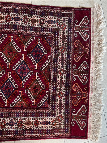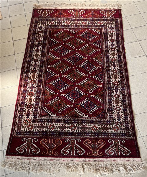 Tappeto Yomut, Turkestan occidentale, inizio secolo XX. Decoro con Memling Gul su fondo bordeaux. Bordura a fondo bianco e due testate bordeaux decorate con motivo Kotchiak o "corna di montone" (cm 177x112) (difetti)