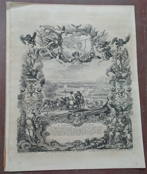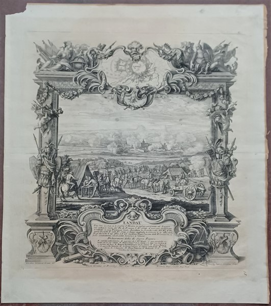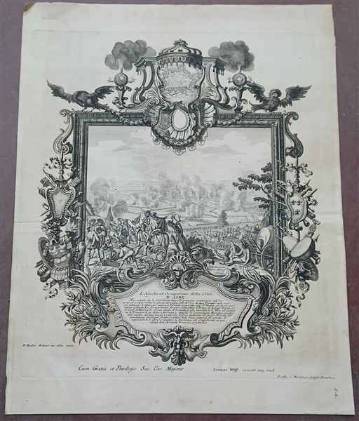 Lotto di tre tavole raffiguranti battaglie terrestri: Landau, Riconquista di Liegi, Occupazione di S. Venant, Assedio della città di Aire. Augusta, Wolff sec. XVIII. Inc. in rame, ogni veduta è contornata da una fastosa cornice ornamentale a motivi naturalistici, architettonici, e allegorici, ogni tavola è corredata da un breve testo esplicativo inciso su altra matrice di rame e inserito nella bordura ornamentale. Dimensioni al foglio ca. mm. 560x450. Piega centrale editoriale, qualche rossura o menda nei margini ma, assai decorative. (3)