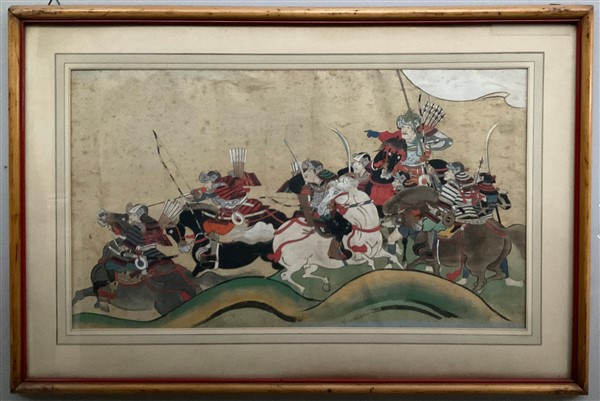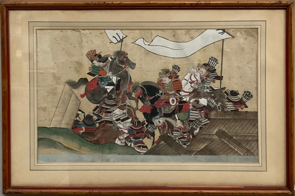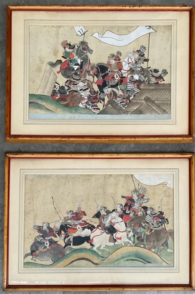 Coppia di dipinti su carta raffiguranti scene di battaglia, in cornici Giappone