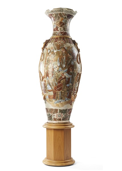 Satsuma porcelain vase decorated with warriors in a landscape (h. cm 126) resting on wooden column (h. cm 49)