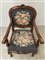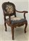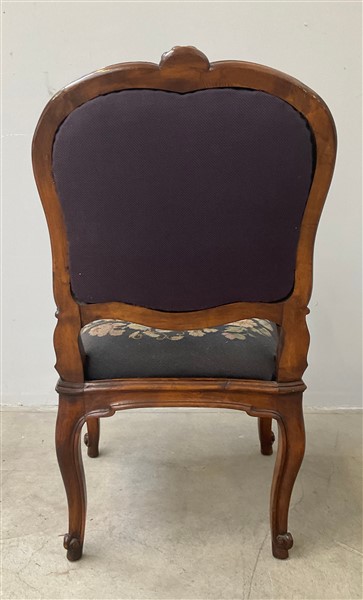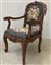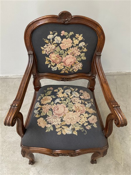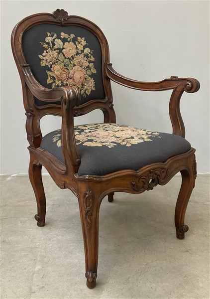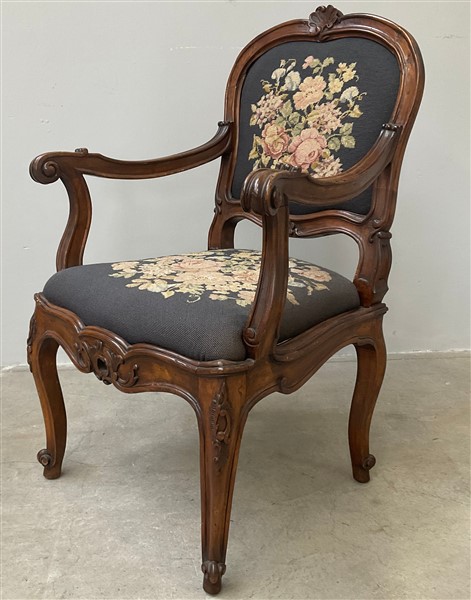 Poltrona in noce con bordi scanalati e schienale centrato da valva di conchiglia, braccioli terminanti a riccioli, fascia traforata, gambe mosse. Rivestimenti in tessuto a piccolo punto (difetti)
