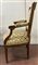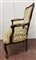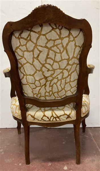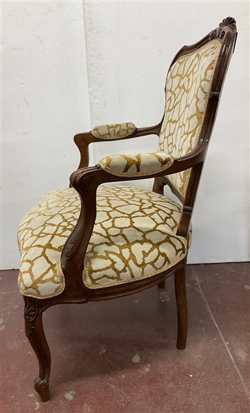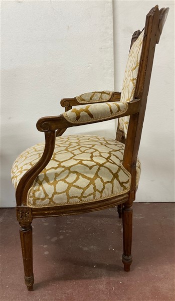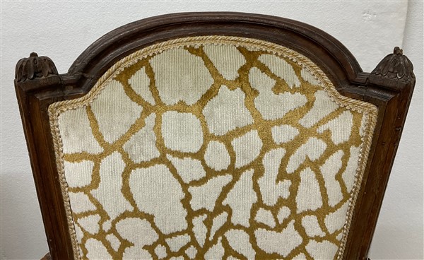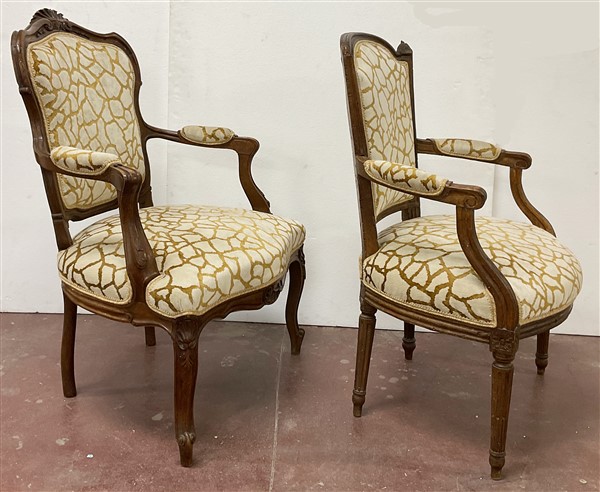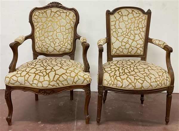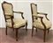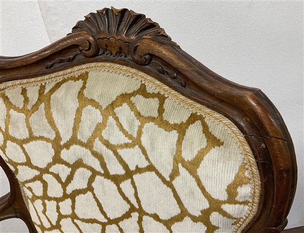 Due antiche poltrone in legno intagliato, una con braccioli a ricciolo e piedi a colonna scanalata, l'altra decorata ad intagli a volute (L. max cm 64) (restauri)