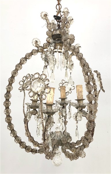 Lampadario a cesto a cinque luci con struttura in metallo decorata da rosette, pendenti e fiori in vetro (h. cm 82) (difetti)