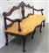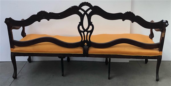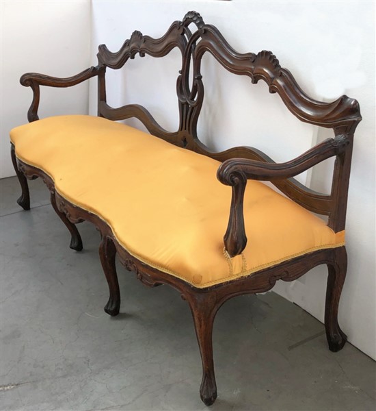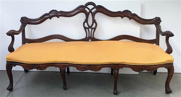 Antico divano in legno intagliato, schienale a giorno centrato da cartella traf