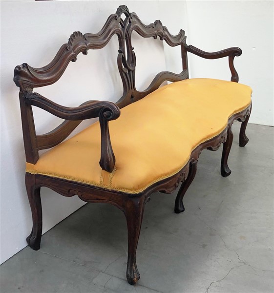 Antico divano in legno intagliato, schienale a giorno centrato da cartella traforata, braccioli a ricciolo (L. cm 177) (restauri)