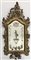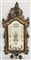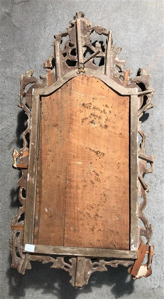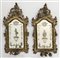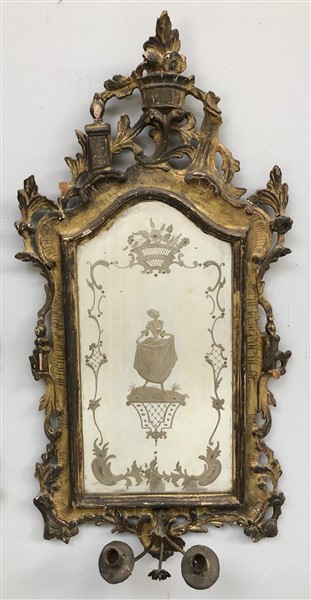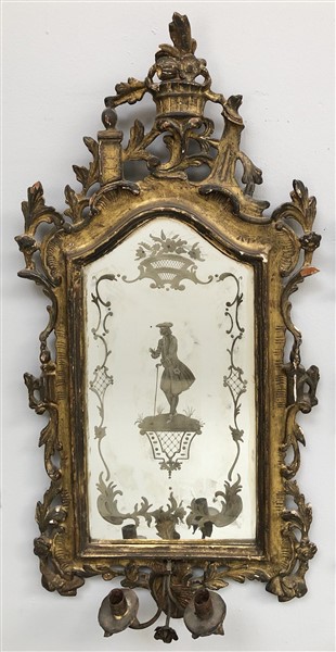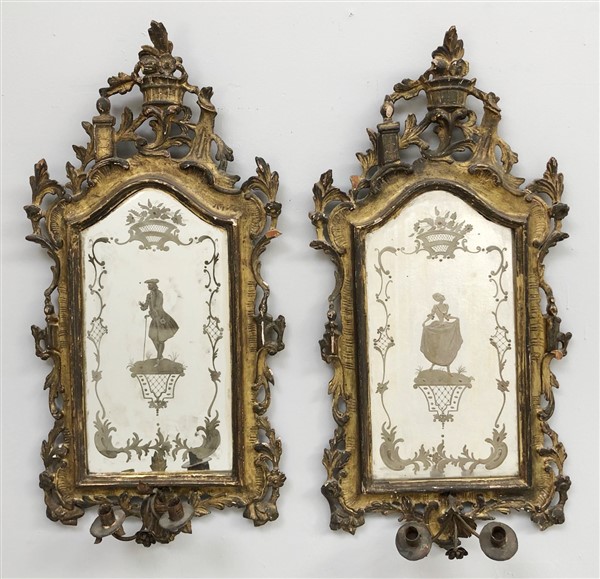 Coppia di specchiere in legno intagliato, traforato e dorato a volute fiorite, specchi incisi con figure, bracci in metallo a due fiamme. Veneto, secolo XIX (h. cm 84x41) (difetti)