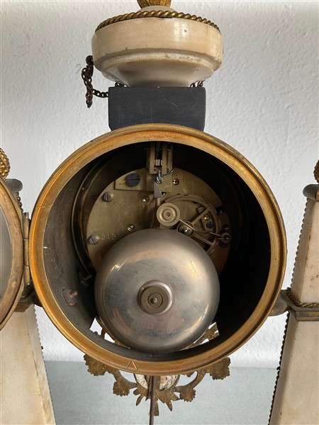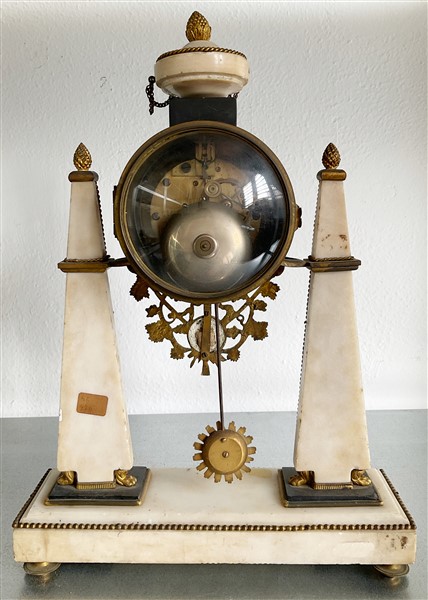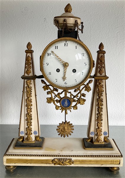Pendola a portico in marmo e bronzo dorato con applicazioni Wedgwood. Quadrante