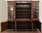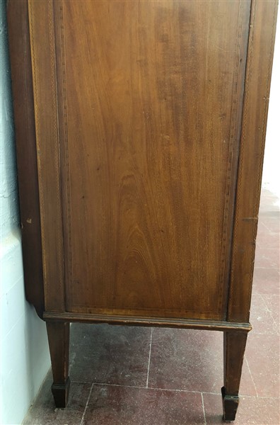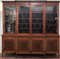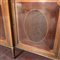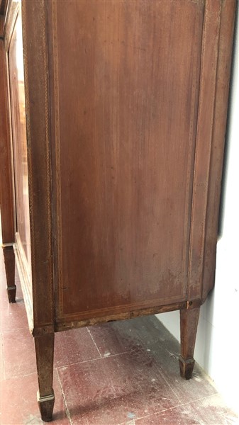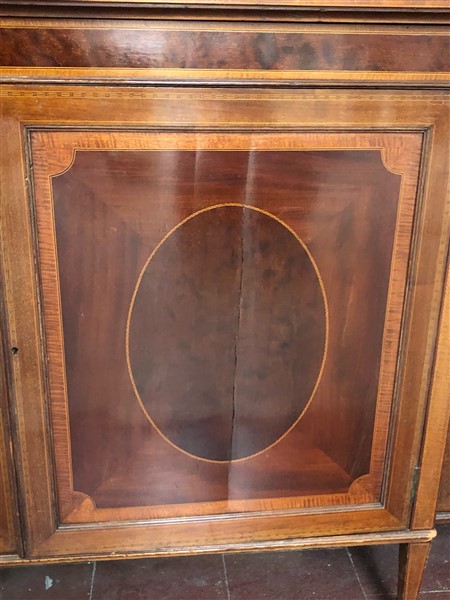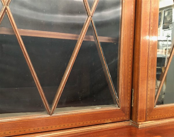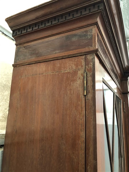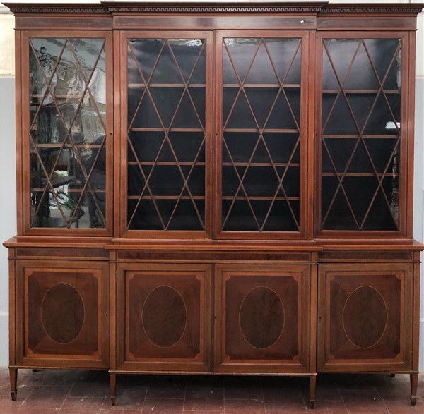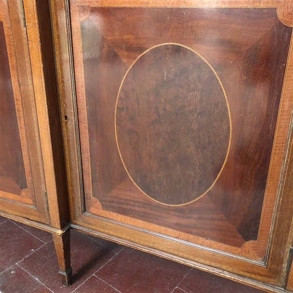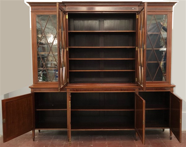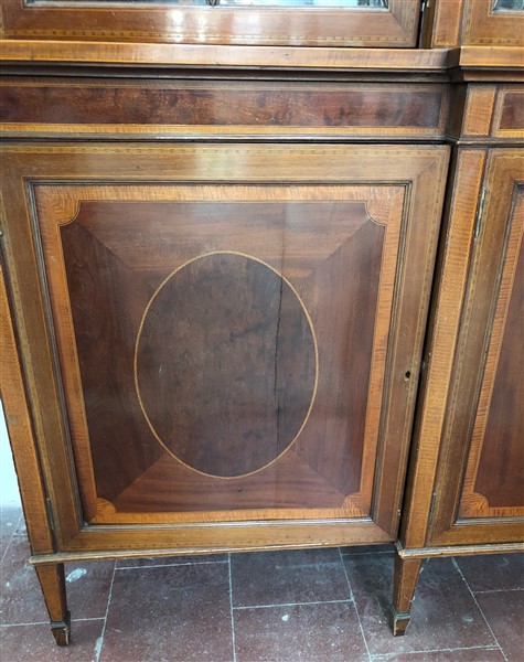 Libreria a due corpi lastronata e filettata in legni vari, parte superiore a quattro ante a vetri, parte inferiore a quattro ante pannellate (cm 260x250x50) (difetti)