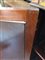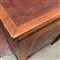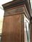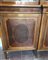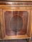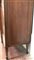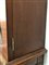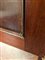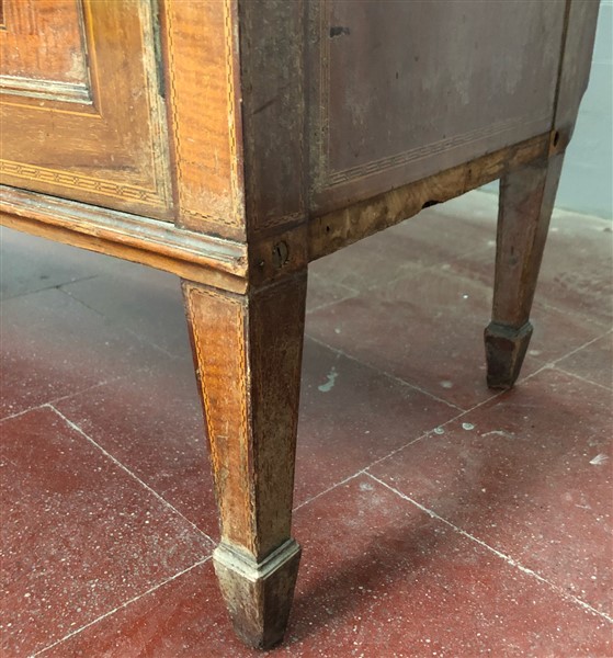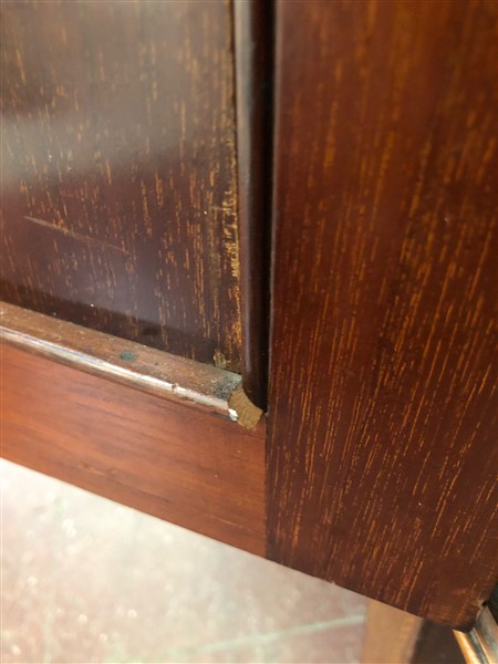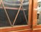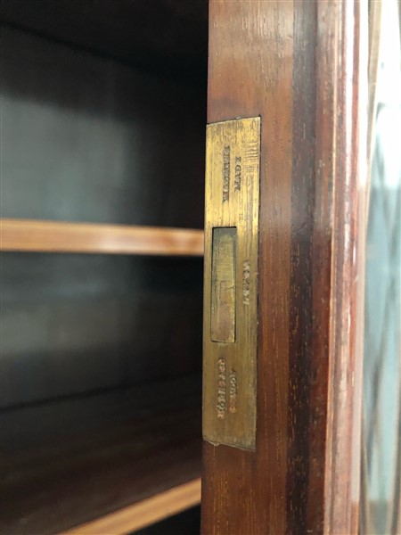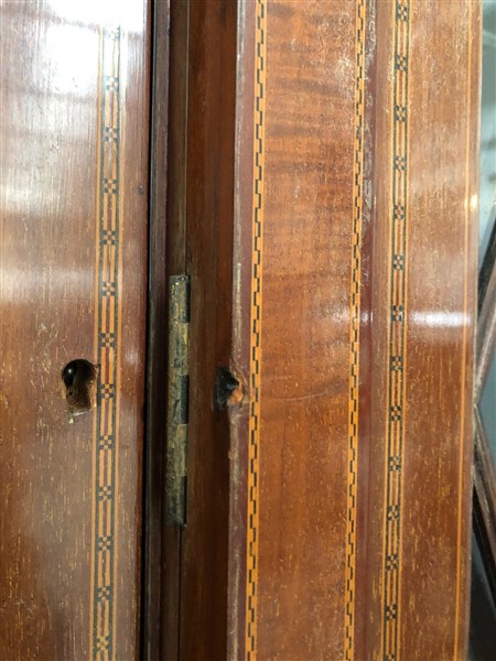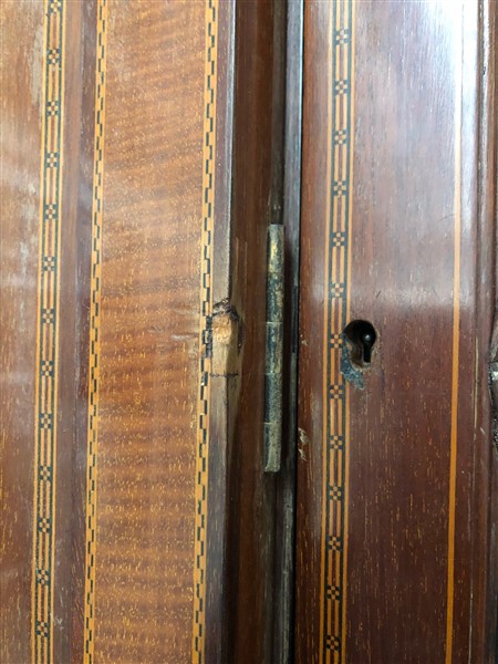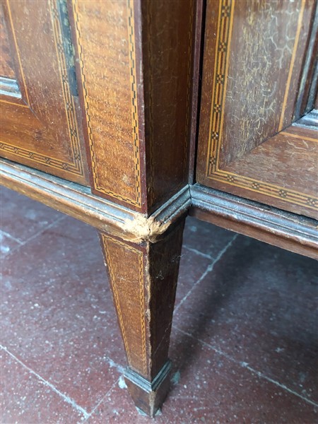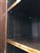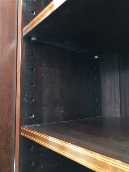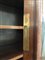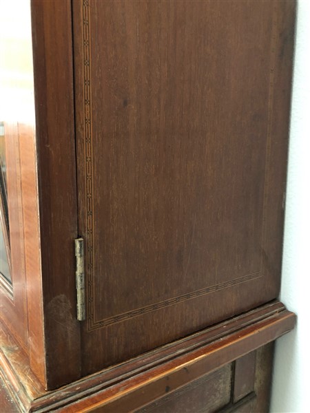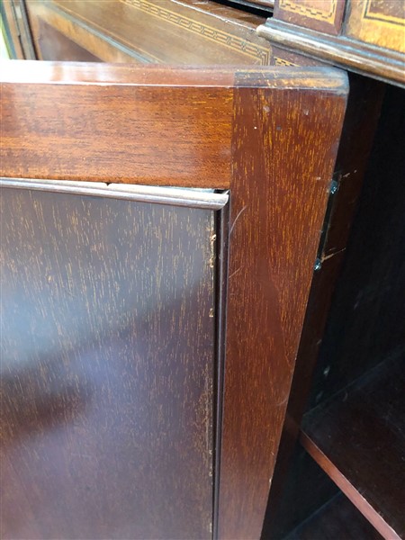 Libreria a due corpi lastronata e filettata in legni vari, parte superiore a qu