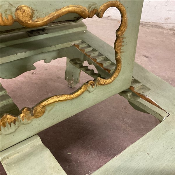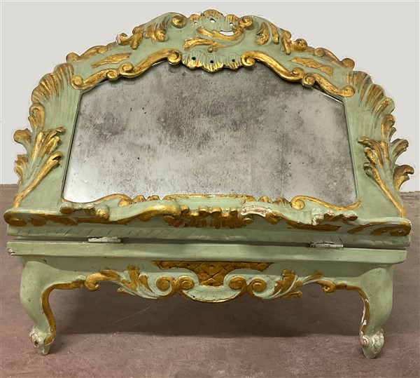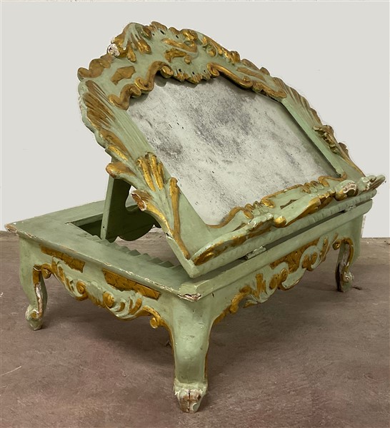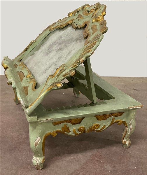 Antico leggio in legno intagliato, dipinto e dorato. Piano con riserva a specch