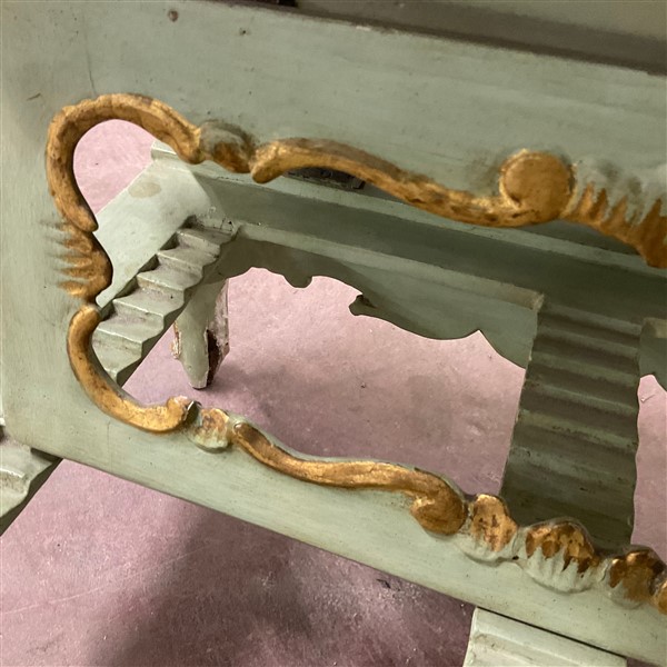 Antico leggio in legno intagliato, dipinto e dorato. Piano con riserva a specchio, bordure a volute e rocailles (largh. cm 55) (difetti)