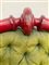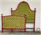 Letto in ferro dipinto con montanti a colonna cimati da sfera, testata e pediera imbottiti e rivestiti (testata cm 158x198; traverse L. cm 218 circa), unito a una base di letto singolo in legno intagliato con piedi ferini (tavolino cm 53x73x38; letto cm tot. 105x209) (difetti)