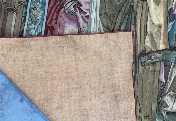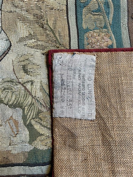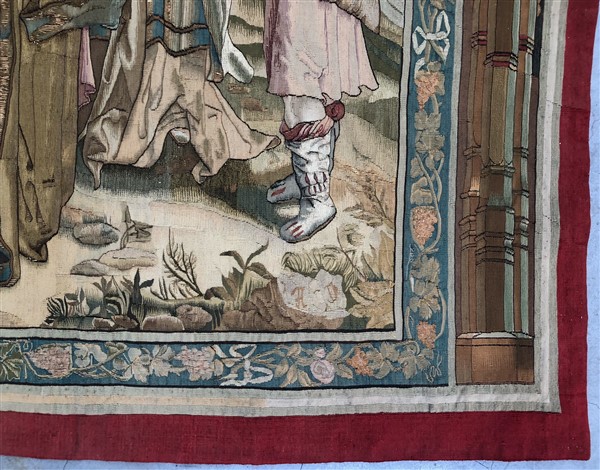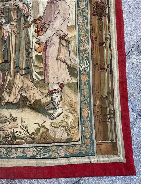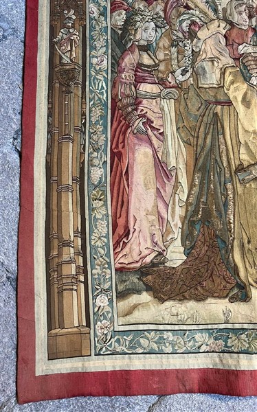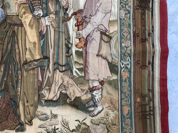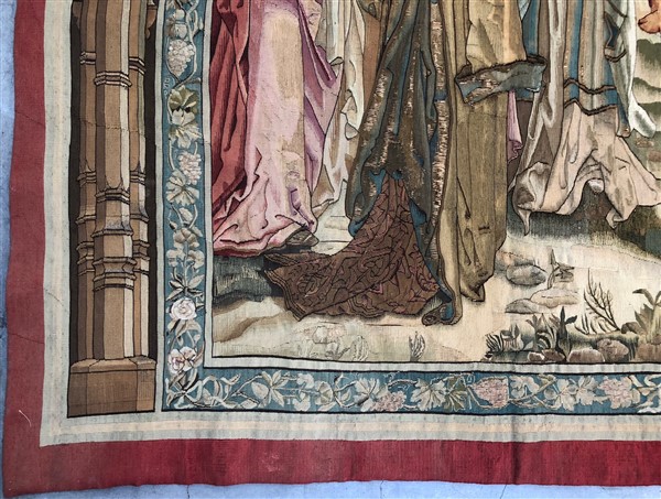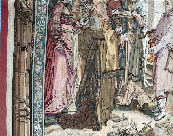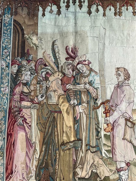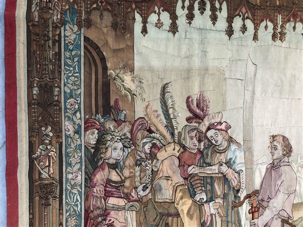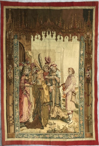 Arazzo neogotico, Inghilterra ? secolo XIX. Decorato da scena di corte con personaggi in abiti medievali entro architettura con colonne e fregi, bordura floreale. Cifrato in basso a destra (cm 224x155) (lievi difetti)