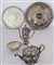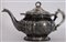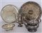 Manifattura inglese, secoli XIX-XX. Lotto composto da due diversi salver, una teiera, una caffettiera e una coppetta in metallo argentato di diverso decoro (lievi difetti)