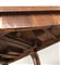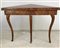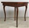 Tavolino da gioco lastronato e filettato in legni vari con piano triangolare ap