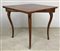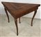 Tavolino da gioco lastronato e filettato in legni vari con piano triangolare apribile, gambe mosse e due cassetti nella fascia. Fine secolo XVIII (aperto cm 75x75xh 73) (difetti e restauri)