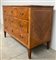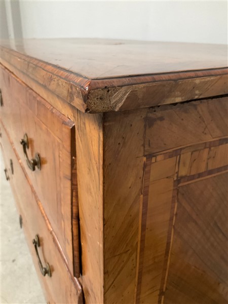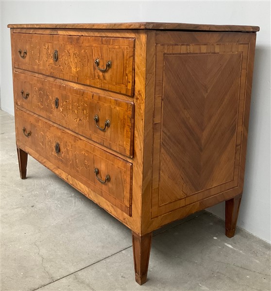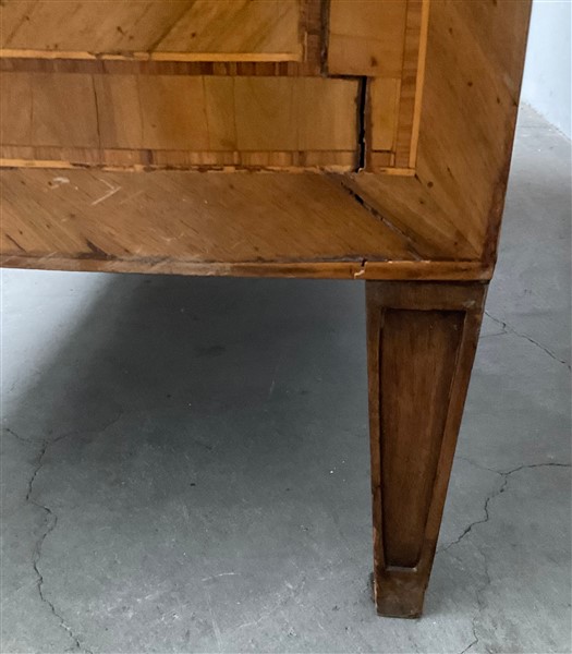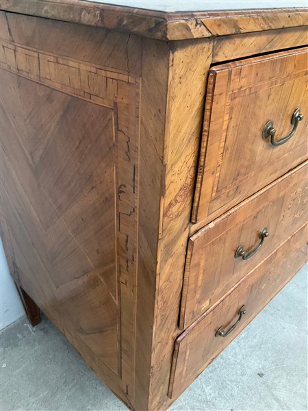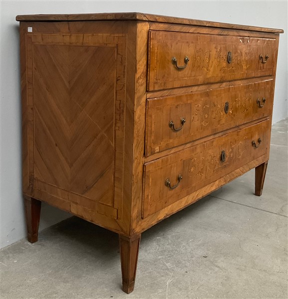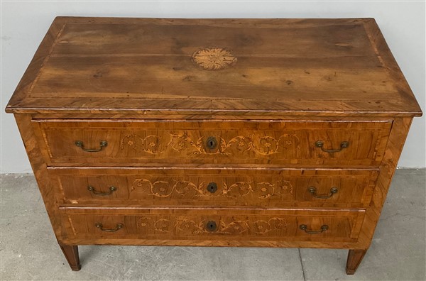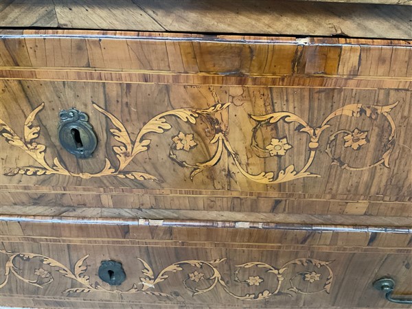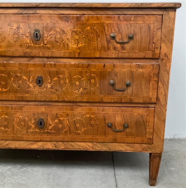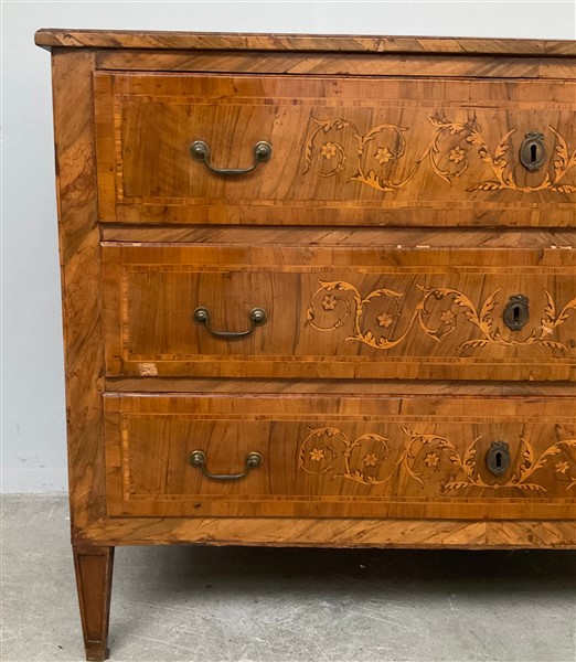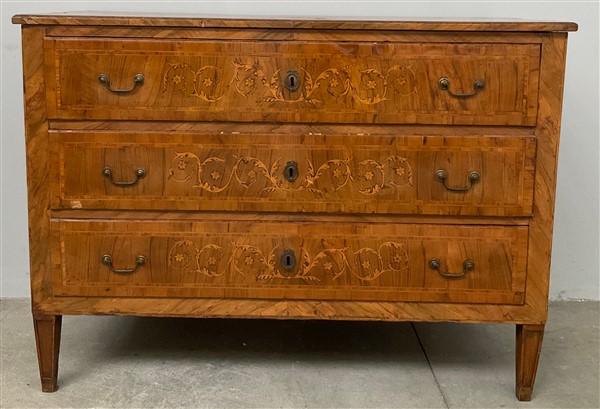 Cassettone lastronato e intarsiato in legni vari, filettato in bois de rose. Fronte a tre cassetti e gambe rastremate non coeve. Decorato a volute fiorite entro riserve. Secolo XVIII (cm 133x96,5x60,5) (difetti e restauri)
