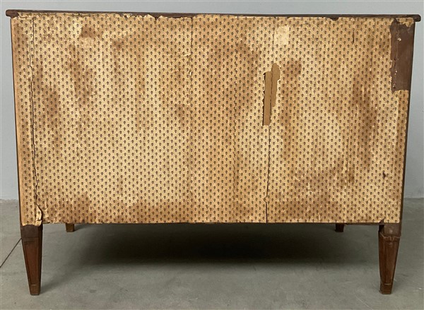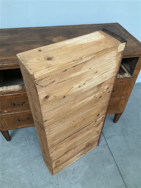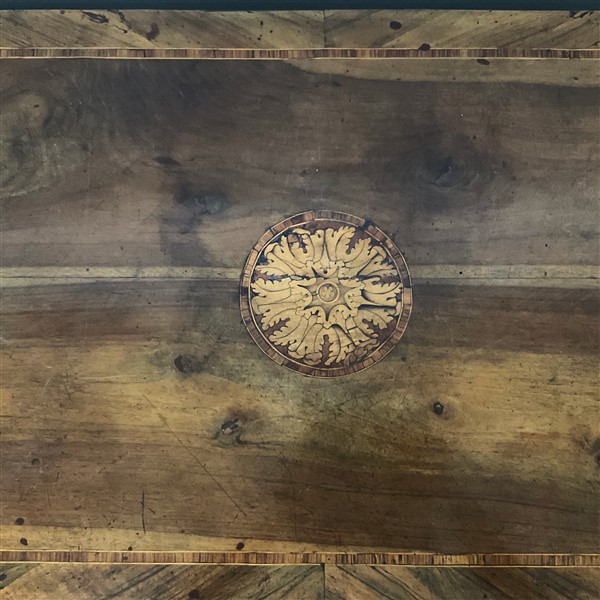 Cassettone lastronato e intarsiato in legni vari, filettato in bois de rose. Fr