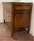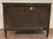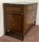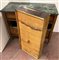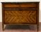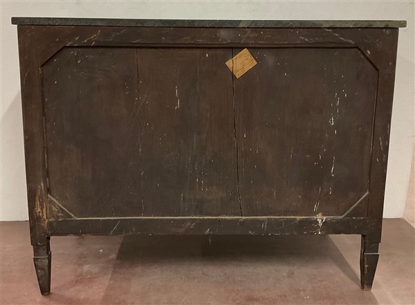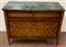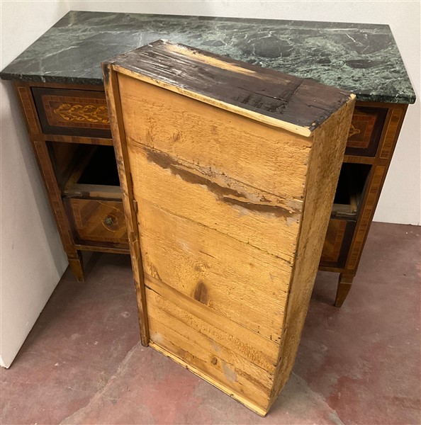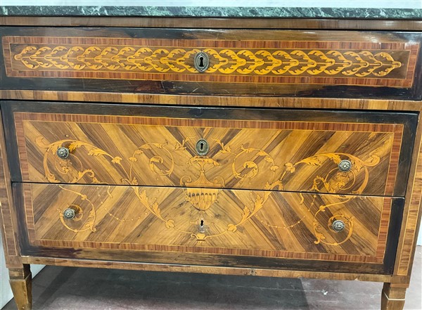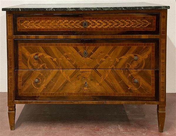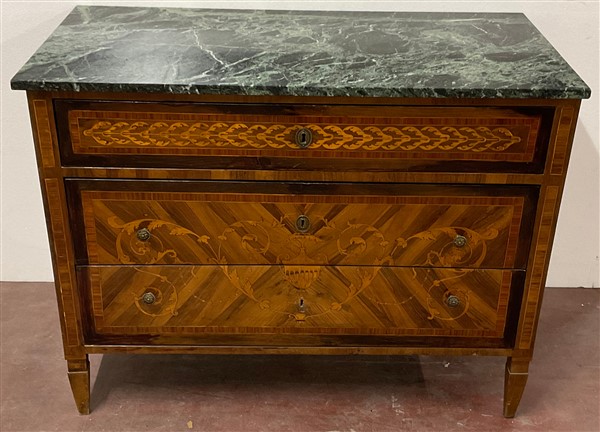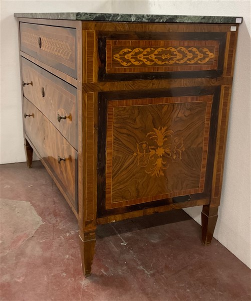 Cassettone lastronato e intarsiato in legni vari. Fronte centrato da vaso tra girali di foglie e fiori con tre cassetti di cui uno a mezza altezza sottopiano, gambe a obelisco rovesciato. Secolo XIX. Piano in marmo verde alpi di epoca posteriore (cm 115x88x58) (difetti e restauri)