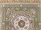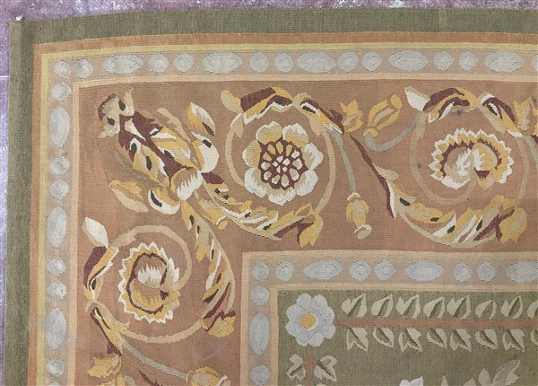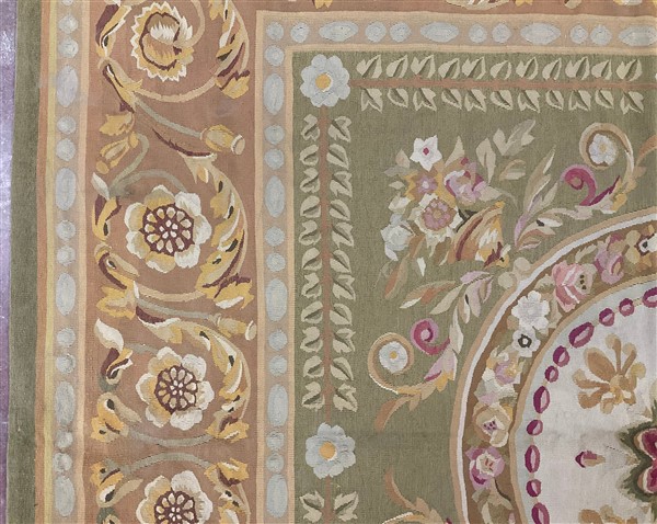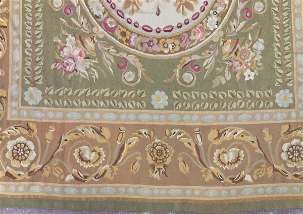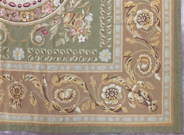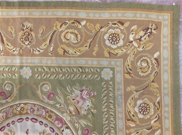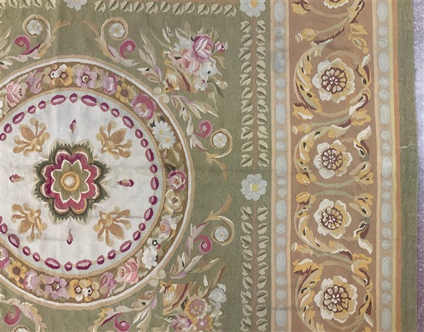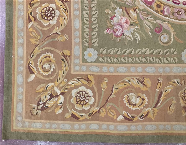Tappeto Aubusson, Francia, recente manifattura. Decoro con medaglione circolare cosparso di fiori e foglie d'acanto su campo verde reseda decorato da quattro vasi fioriti. Bordura su fondo nocciola (cm 206x202) (gravi difetti)
