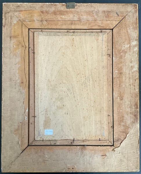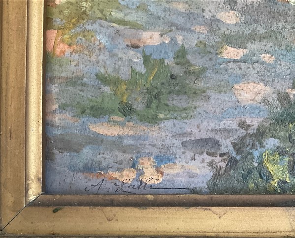 "Paesaggio montano con figura femminile" olio su tavoletta(cm 20x30) Firmato in basso a sinistra. Al retro: iscrizione. In cornice (difetti)