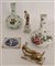 Lotto composto da due bottiglie in maiolica con decoro floreale in policromia delle quali una marcata Lodi, una piastrella da camino decorata in blu a figura e due diverse figurette in porcellana. Epoche e manifatture differenti (h max cm 22,5) (difetti e restauri)