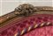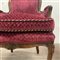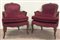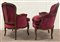 Coppia di poltrone in noce intagliato di forma mossa, braccioli e gambe terminanti a ricciolo, schienale e fascia centrate da fiori. Rivestite in velluto bordeaux (difetti)