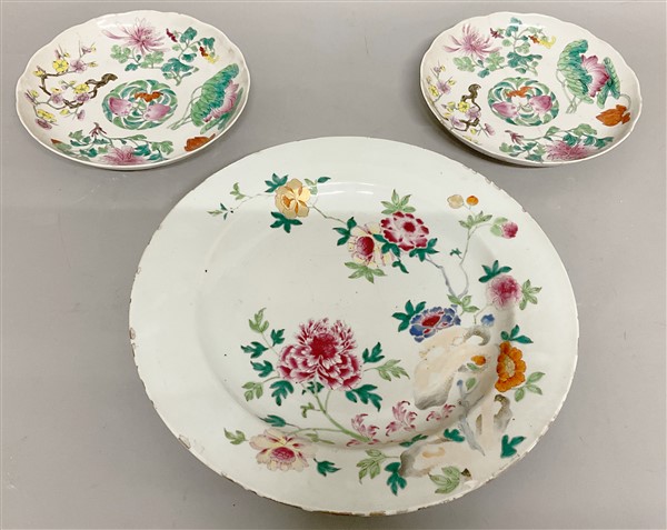 Lotto composto da un grande piatto ed una coppia di piatti in porcellana Famiglia Rosa con decoro policromo floreale.