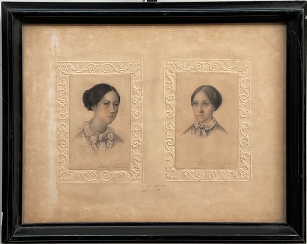 Luisa San Martino, Ritratti di Vittoria Cima e Rina D'Azeglio, Coppia di disegni a tecnica mista su carta, (cm 11,5x8) in unica cornice, Firmati, datati (settembre 1851) e locati (Sestri) in basso al centro del passepartout, difetti. In cornice