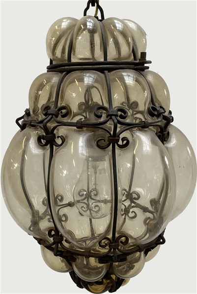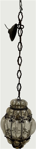 Lampada a sospensione in vetro soffiato a baccellature entro gabbia in ferro forgiato. Inizio secolo XX (h tot cm 75). (difetti)