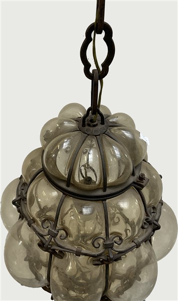 Lampada a sospensione in vetro soffiato a baccellature entro gabbia in ferro fo