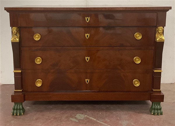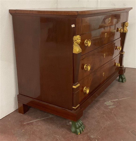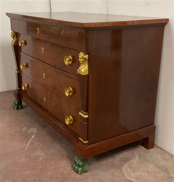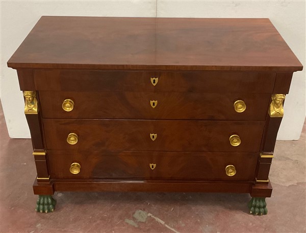 Cassettone Impero in piuma di mogano a quattro cassetti di cui uno a mezza lunghezza, montanti terminanti a busto di Erma. Fregi in bronzo e zampe ferine. Francia, secolo XIX (cm 128x88x61) (lievi difetti)