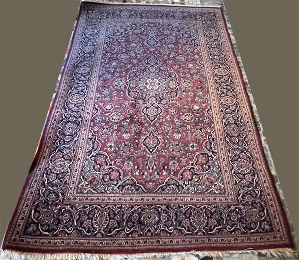 Tappeto Keshan, Persia, secolo XX. Decoro con medaglione lanceolato su campo color ciclamino cosparso di fiori (cm 213x135) (difetti)