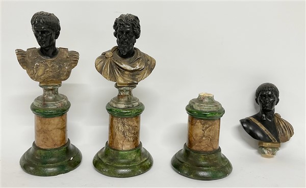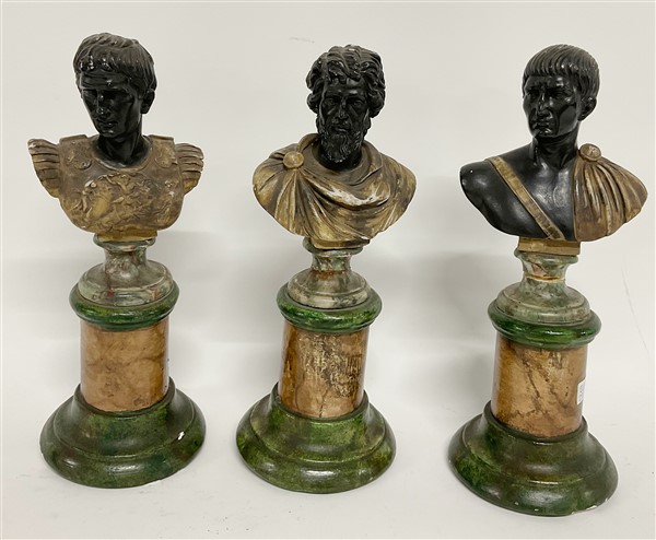 A. Santini. Tre busti a finto marmo raffiguranti imperatori romani su semicolonna. Iscritti "Italy A.S" (h. max cm 26 ) (difetti e restauri)