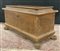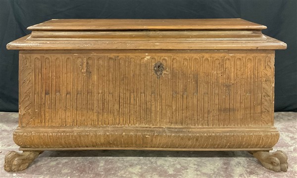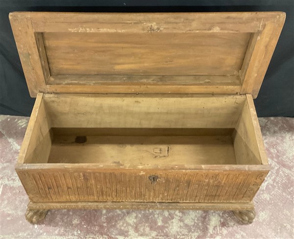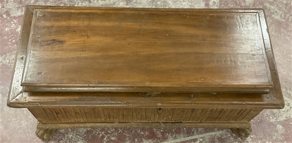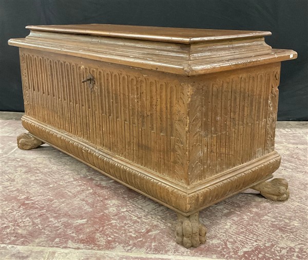 Antica cassapanca ad urna in noce intagliata a motivi vegetali, scanalature e baccellature. Quattro piedi ferini (cm 121x54x56) (difetti)