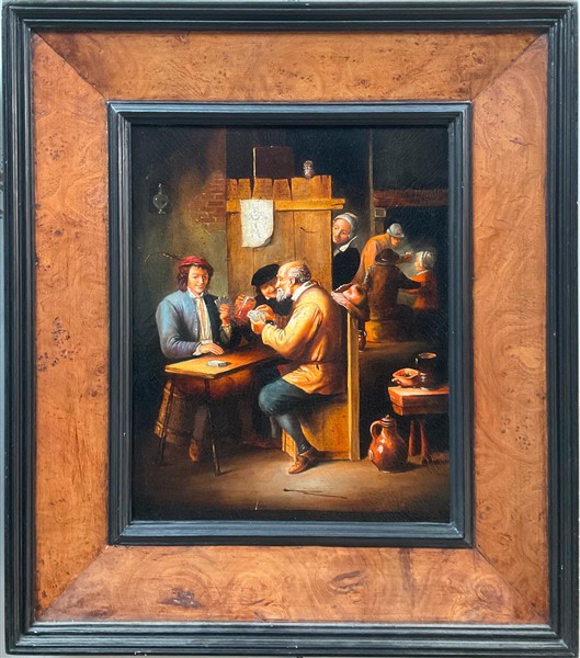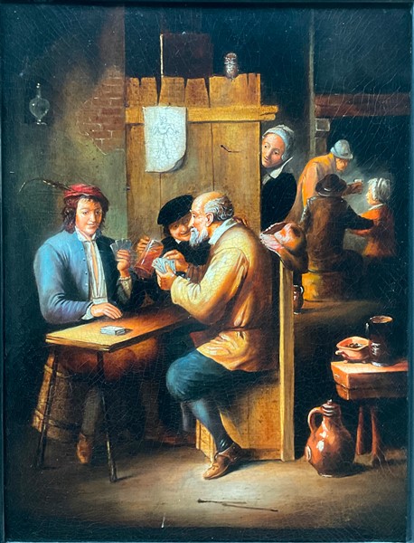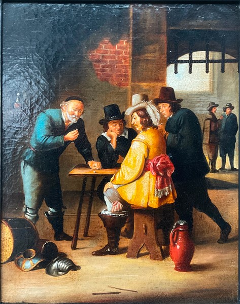 Da David Teniers, Lotto di due dipinti ad olio su tela raffiguranti "Scene di giochi in taverna" (cm 29,5x24)